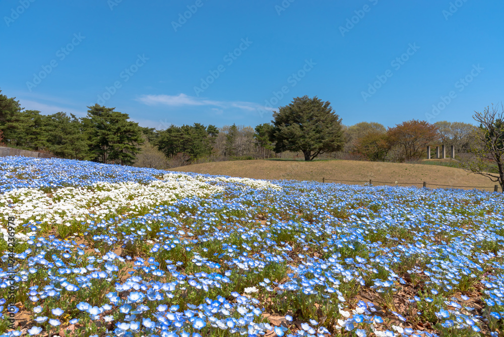 Mountain Tree And Nemophila Baby Blue Eyes Flowers Field Blue Flower Carpet Japanese Natural Attraction Hitachi Seaside Park Ibaraki Japan Stock Photo Adobe Stock